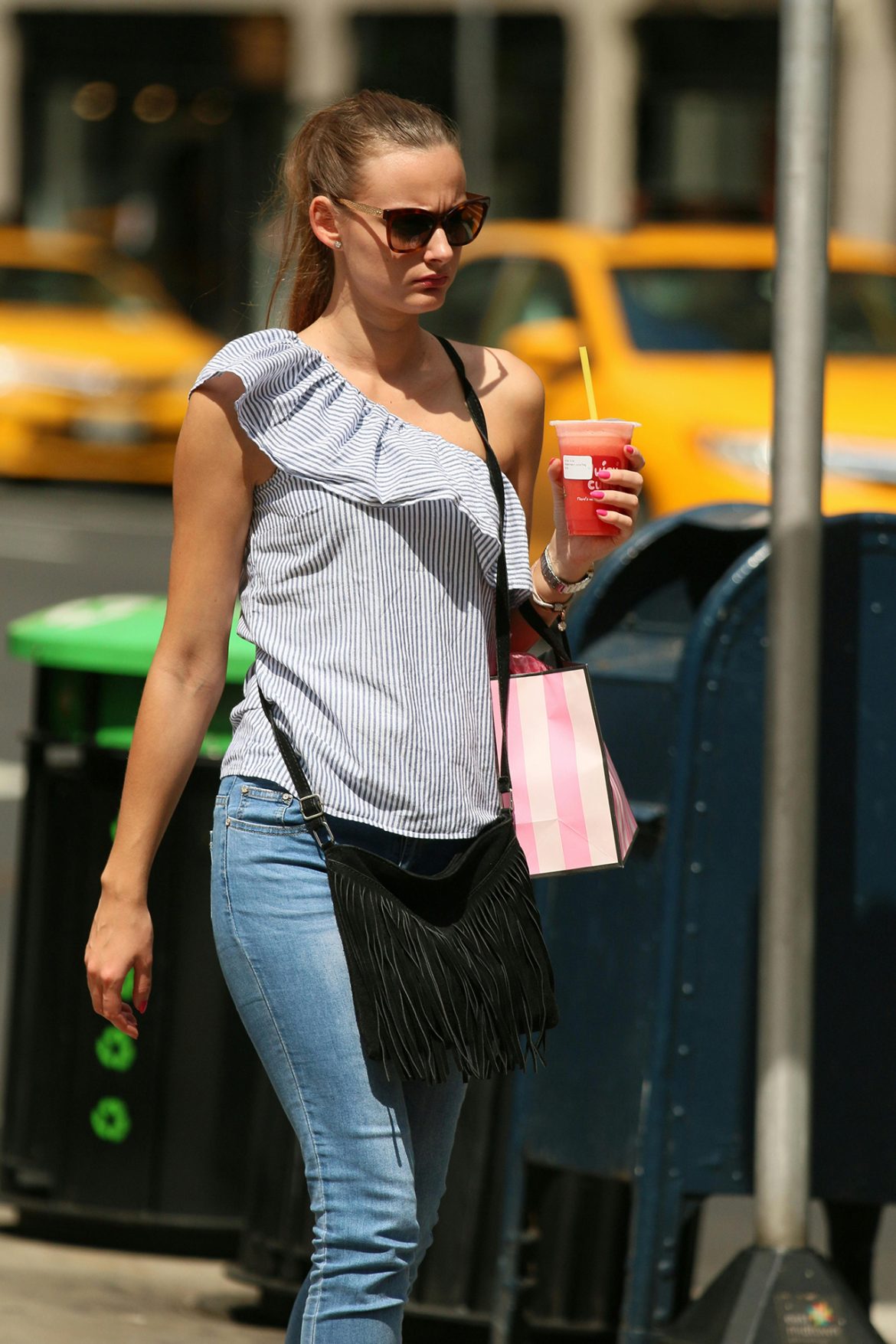 Matching sets are always a winning choice, and if you want an easy way to rock suede, coordinating pieces are the way to go. Sasha looks absolutely stunning in a suede jacket paired with a matching mini skirt, crafting the ideal fall outfit. To keep things seasonally appropriate, she completes her look with sheer tights and stylish chocolate heels, creating an ensemble that’s sure to turn heads.